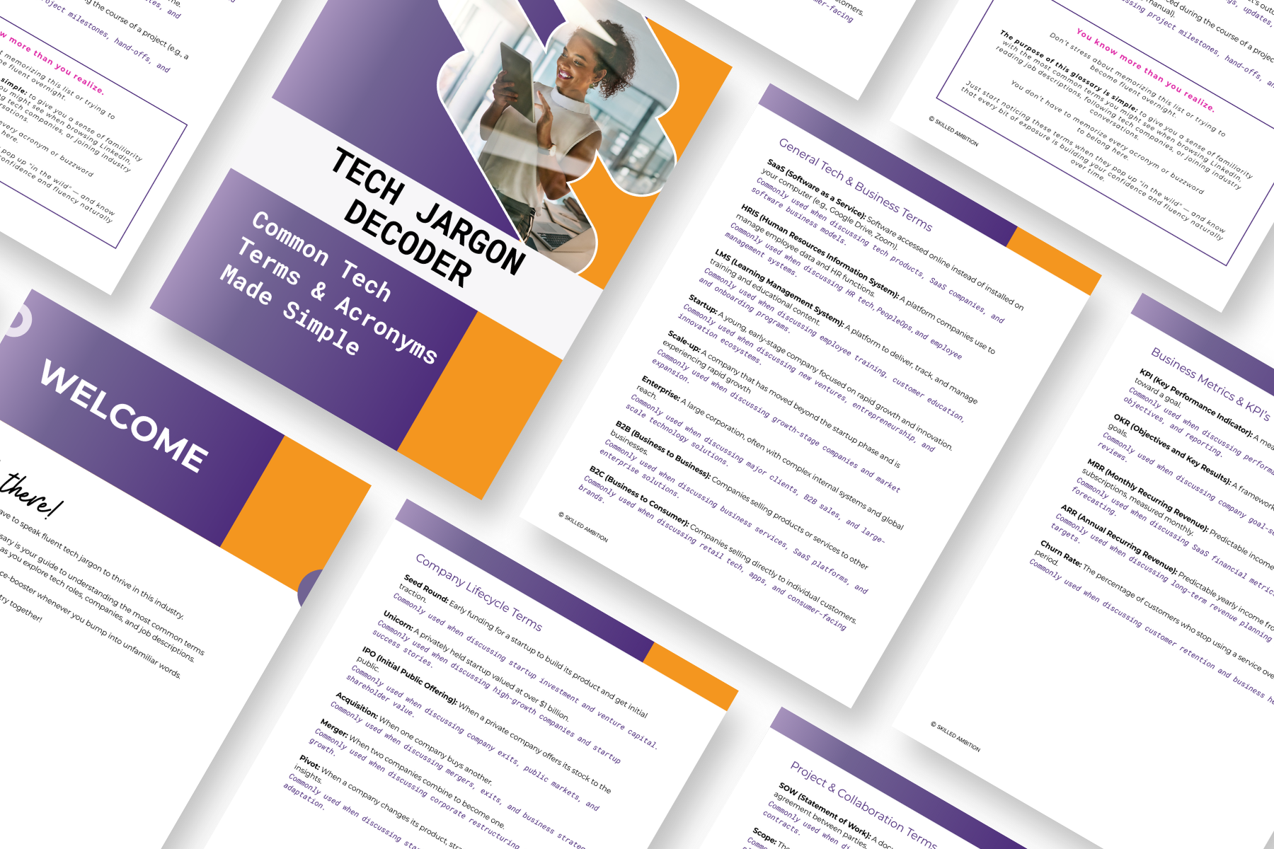 The Tech Jargon Decoder Glossary is a quick-reference guide covering 40+ of the most common tech terms and acronyms you'll encounter in job descriptions, LinkedIn posts, and company research.